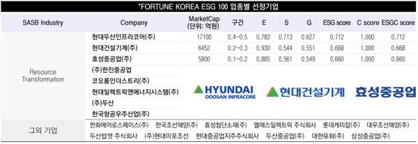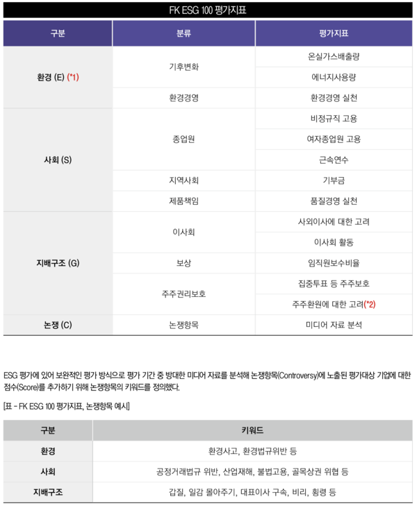 FK ESG 100 최종 선정은 핵심 평가지표 13개와 산업별 정보의 중요성과 가중치를 고려한 점수를 산업 내 비교 방식으로 등급화한 후 산업별 분포를 고려한 통계적인 점수 등을 종합적으로 고려해 최종 ESG Leaders Group을 선정했다.