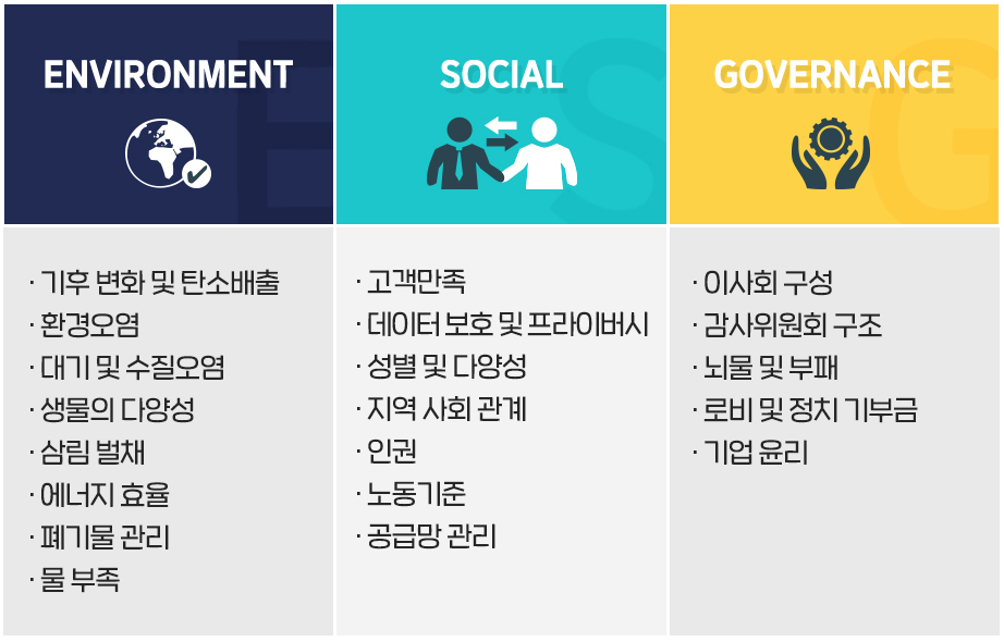 ESG는 크게 환경(E), 사회(S), 지배구조(G) 등 세 가지 요소의 이슈를 통해 평가된다. 환경은 기후변화 대응을 위한 ‘탄소중립’이 대표적이다. 전세계적으로 2050년까지 탄소 순배출량 0이 되는 탄소중립 사회로의 전환이 목표이며, 우리나라는 2030년까지 2017년도 대비 24.4% 감축이 목표다. 이 목표치를 향해 기업이 어떤 노력과 성과를 냈는지를 평가한다. 사회 요소 이슈는 지속적으로 변화되는 사회문제들을 해결하는 기업이 지속 가능할 것으로 판단해 평가하는 지표다. 크게 근로환경, 노사관계, 이해관계자 만족, 지역사회 기여, 노동환경, 성평등 문제에 대한 대응을 주로 들여다본다. 지배구조는 경영진이 올바른 의사결정을 하도록 이사회의 지원과 주주권리 보호, 투명 경영의 이슈를 말한다.