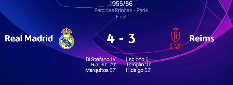 레알마드리드와 스타드 랭스의 결승전은 많은 관중이 보는 앞에 치뤄졌습니다. 프랑스가 주관한 경기 답게 파르크 데 프랭스에서 펼쳐 졌습니다. 결승전 답게 골도 많이 터져 역전의 역전을 거듭하며 레알마드리드가 스타드 랭스를 4-3으로 승리하였습니다.