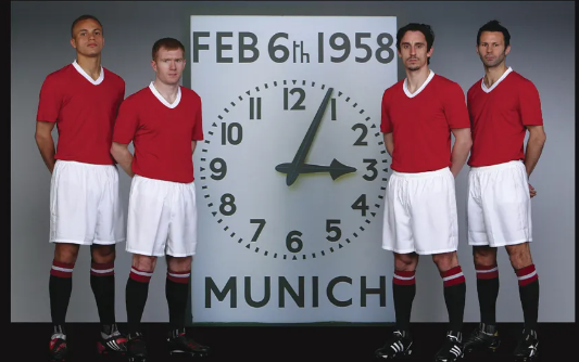 1958년 2월 6일, 맨유가 유고슬라비아(지금은 세르비아)의 FK 츠르베나 즈베즈다와의 유러피언컵 8강 원정 경기를 치르고 선수단 비행기로 귀국하는 중 일어났습니다. 유고슬라비아에서 잉글랜드로 돌아오던 영국 유러피언 항공 비행기가 경유지 뮌헨 공항에서 이륙하던 도중에 기체가 전복되었습니다. 이 사고로 맨체스터 유나이티드 선수단 8명, 스태프, 기자단 총 23명이 사망하였습니다.
