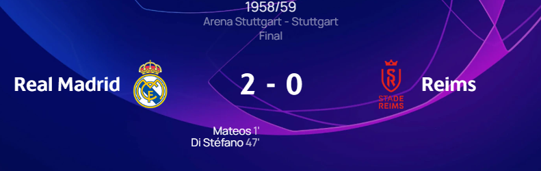 결승에서 3년만에 만나는 레알마드리드와 스타드 랭스, 결승은 슈투트가르트의 홈구장에서 펼쳐졌습니다. 마테오스와 디 스테파노의 골로 레알마드리드가 4회 연속 우승을 차지하게 됩니다.