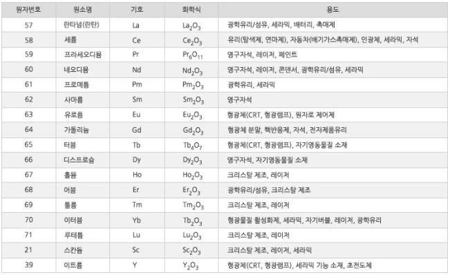 희토류는 화학적으로 매우 안정하고, 건조한 공기에서도 잘 견디며, 열을 잘 전도하는 특징이 있으며, 상대적으로 탁월한 화학적·전기적·자성적·발광적 성질을 갖는다. 현대사회에서 희토류는 전기 및 하이브리드 자동차, 풍력발전, 태양열 발전 등 21세기 저탄소 녹색성장에 필수적인 영구자석 제작에 꼭 필요한 물질이다. 예를 들어, 전기자동차 한대를 움직이는 데 필요한 영구자석에는 희토류 원소가 약 1kg가량 포함되어 있다. 또한 희토류는 LCD·LED·스마트폰 등의 IT산업, 카메라·컴퓨터 등의 전자제품, CRT·형광램프 등의 형광체 및 광섬유 등에 필수적일 뿐만 아니라 방사성 차폐효과가 뛰어나기 때문에 원자로 제어제로도 널리 사용되고 있다.