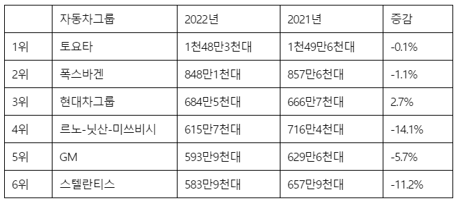 현대차그룹의 '빅3' 진입은 지난해가 처음으로, 2010년 포드를 제치고 5위를 차지한 후 12년 만에 이룬 쾌거다.