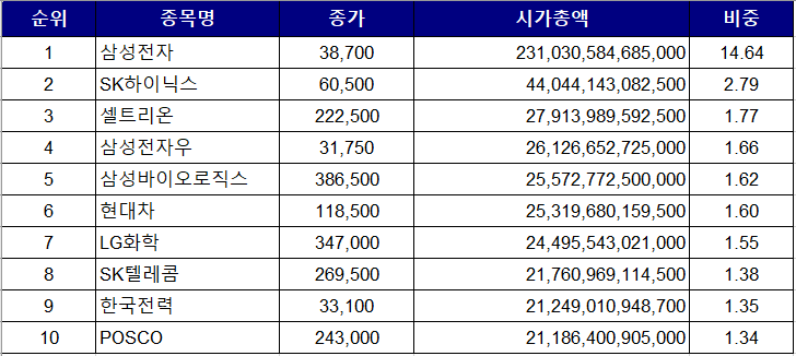 SK하이닉스와 한국전력의 약진, 삼성에스디에스의 신규 진입. 현대모비스와 기아차가 안보이네요.