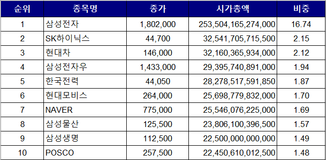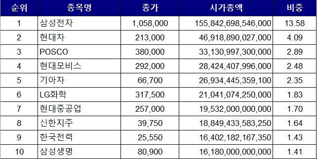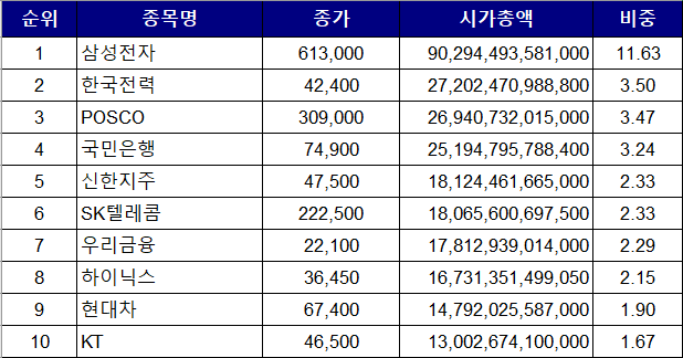삼성전자의 비중이 엄청나게 줄었다. POSCO의 약진. 거기에 현대중공업 신규진입. SK에너지는 현재 SK이노베이션이다. 현대중공업은 현재 한국조선해양.