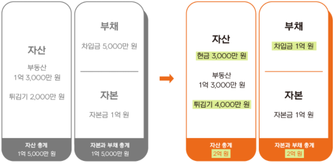 자금의 활용을 나타내는 차변은 현금에서 부동산, 튀김기로 바뀌었지만, 자금의 조달을 나타내는 대변에는 변화가 없음을 알 수 있습니다.