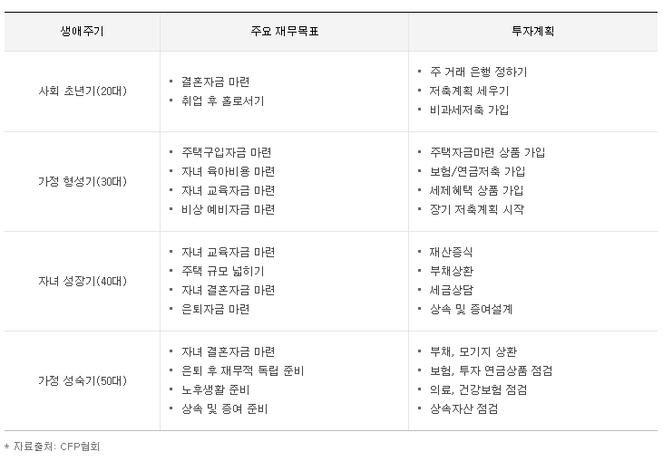 생애주기에 따라 투자 목표는 다르게 수립될 수 있다. 성인이 된 다음의 생애주기는 준비 기간–근로 기간–은퇴 기간으로 구분할 수 있다. 준비 기간을 미혼 기간, 근로 기간을 가족 생활 기간, 은퇴 기간을 노후 생활 기간으로 구분하기도 한다. 하지만 요즘에는 결혼을 늦게 하거나 하지 않는 사람도 적지 않은 데다, 결혼을 하더라도 자녀를 갖지 않거나 이혼 또는 재혼하는 사람도 많아서 이 같은 기준을 모든 사람에게 적용할 수는 없다.