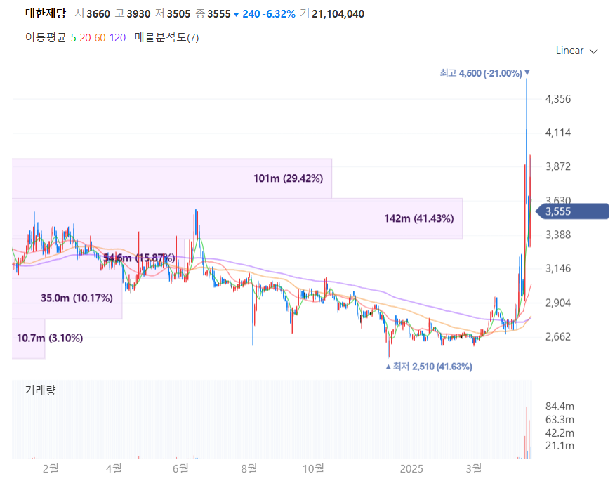 2025년 4월 기준, 대한제당의 주가는 전월 대비 약 12.6% 상승하며 강세를 보였습니다. 특히 4월 21일 기준으로는 3,795원까지 치솟으며 거래량도 크게 증가했죠.
