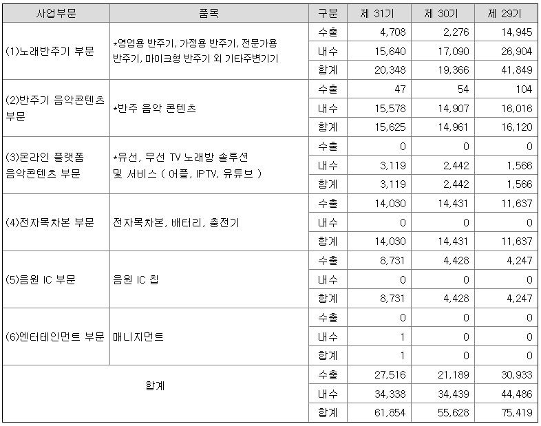 - 음원 IC 판매 증가하였으나, COVID-19 장기화에 따른 사회적 거리두기로 노래방 이용 수요가 감소하는 등 반주기 판매 부진하며 전년동기대비 매출 규모 축소.