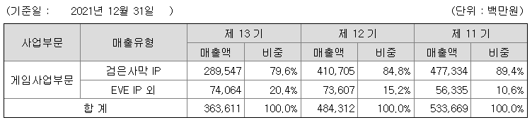 - 2021년 9월 전년동기 대비 연결기준 매출액은 25.4% 감소, 영업이익은 87.4% 감소, 당기순이익은 49.6% 감소. 매출의 80% 이상을 꾸준히 검은사막 IP가 차지하는 등 대표작이 매출에서 차지하는 비중이 여전히 견조함. 2021년 8월 5일에는 중국 시장에 'EVE Echoes'를 출시하며 사전 예약자 590만명 기록하는 등 중국 시장에 성공적으로 안착함.