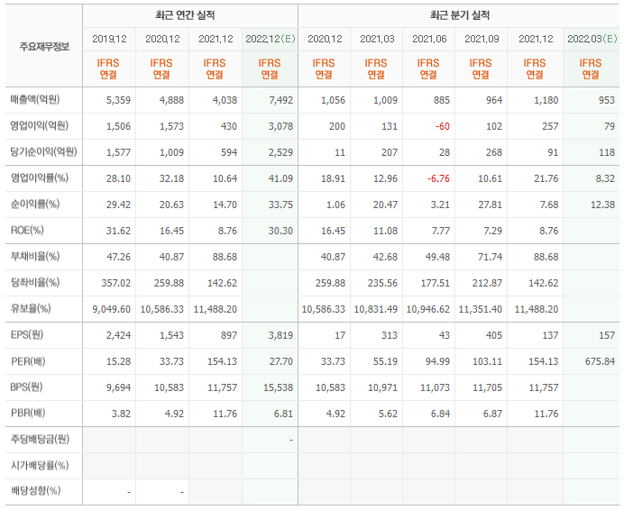 - 매출, 영업이익, 당기순이익이 2019년 부터 줄어들고 있으나, 2022년부터 큰 상승이 예상된다.