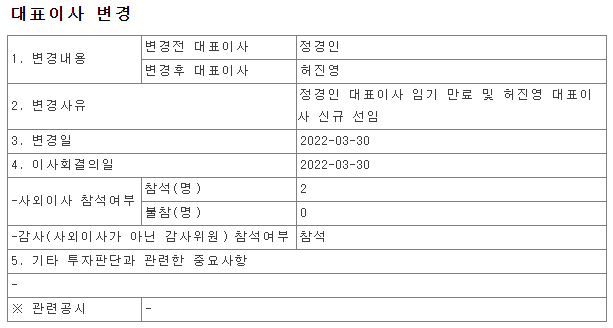 - 허진영 신임 대표이사는 온네트, SK커뮤니케이션즈, 카카오에서 근무, 펄어비스 COO부터 승진하여 대표이사로 선임 되었다.