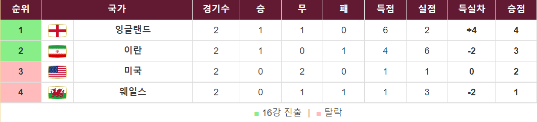 현재 급한건 미국이다. 미국은 애매모호한 경기력으로 2무를 거두게 돼... 이란보다 불리한 상황이다. 이란은 비기기만 하면 진출 시나리오 가능. 하지만 이란도 잉글랜드에 대패했기 때문에... 불안한건 마찬가지.
