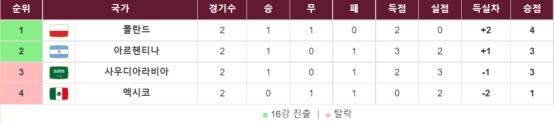 16강 공무원이라 불리던 멕시코는 이번에 승리하지 못할 경우, 공무원 은퇴가 예상된다. 그래서 모든 힘을 다해 뛸 것 같다. 사우디아라비아 입장에서는 피지컬이 우수한 폴란드보다 아르헨티나 경기력이 더 좋았던 것 만큼 멕시코 전에서도 그 이점을 살리는 축구를 할 것으로 예상된다. 두팀 다 지게 되면 힘든 싸움이 될 수 있어, 난타전이 예상된다. 아르헨티나도 전력을 다해서 할 것이기 때문에 폴란드의 승리는 바라는 행위는 하지 않는 것이 좋다.